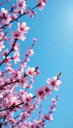 delicate cherry blossom branches against bright blue spring sky, blue sky, bloom