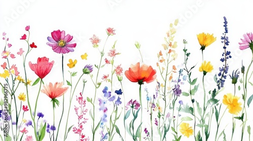 delicate collection of watercolor wildflowers with loose expressive brushstrokes vibrant petals and stems stand out against white background creating whimsical botanical illustration