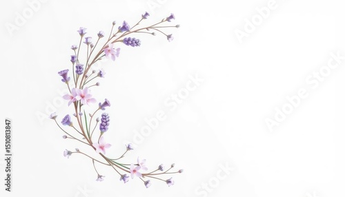 Delicate crescent of lilac and pink blossoms on a pure white background