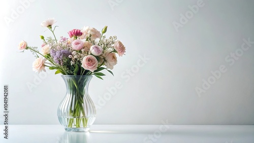 Delicate crystal vase with pastel flowers on white background