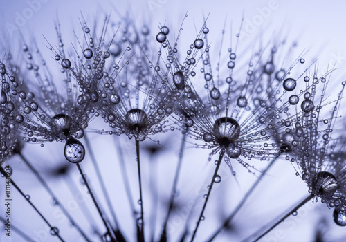 Delicate dandelion seeds adorned with sparkling water droplets create a dreamy, ethereal nature moment
