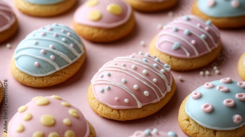 Delicate Easter-themed cookies, adorned with pastel icing and beautiful designs, create a festive atmosphere perfect for holiday celebrations and sweet treats.