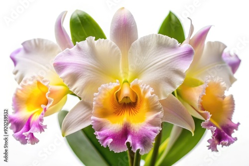Delicate, exotic Cattleya orchid blooms in soft pastel hues, showcasing intricate petals and golden yellow center, set against a clean white background.