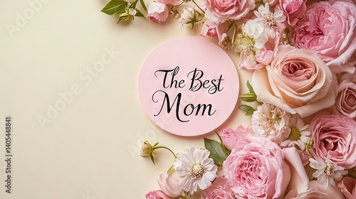Delicate flat lay of pink roses and carnations with elegant “The Best Mom” text on a pastel backdrop for Mother’s Day tribute