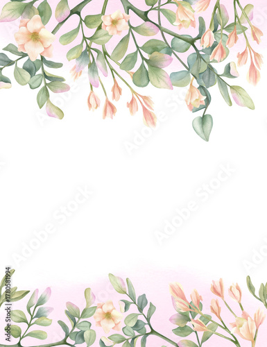 Delicate floral template, frame with beige freesia, leaves of pistachio, eucalyptus illustration, pink watercolor stain. Pastel spring composition with empty space isolated from background for text