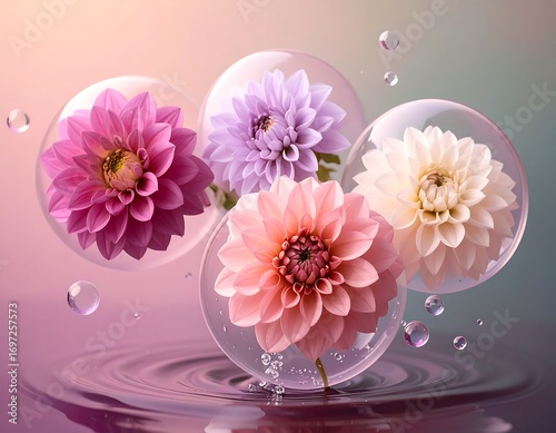 Delicate flowers in translucent bubbles over water