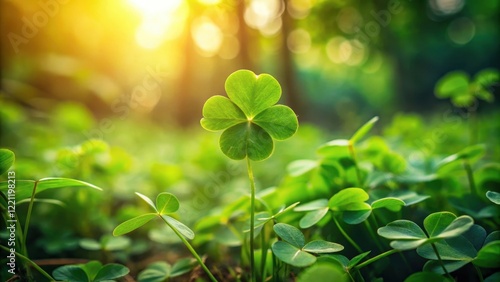 Delicate four-leaf clover nestled among lush green leaves and stems in a natural forest setting, nature photography, four leaf clover