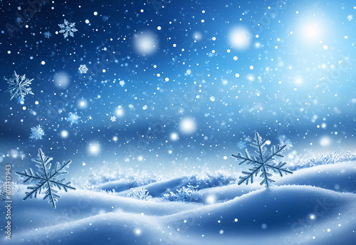 Delicate, frosty snowflakes drifting through a glowing, ethereal winter sky. The background is a gradient of cool blue hues, dotted with twinkling light orbs, resembling a festive, frozen dreamscape