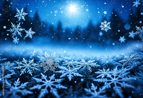 Delicate, frosty snowflakes drifting through a glowing, ethereal winter sky. The background is a gradient of cool blue hues, dotted with twinkling light orbs, resembling a festive, frozen dreamscape
