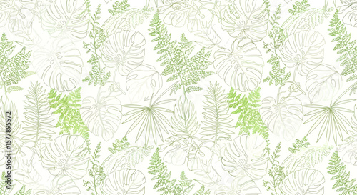 Delicate green line art of tropical leaves including monstera and fern fronds.