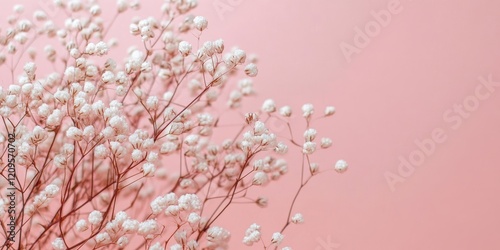 Delicate Gypsophila flower branch in soft white against a light pink background featuring dreamy pastel tones and ample copy space on the right