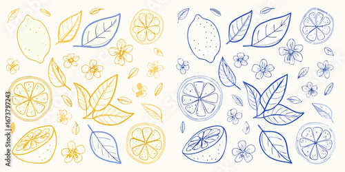 Delicate hand drawn lemons and flowers in yellow and blue on a white background