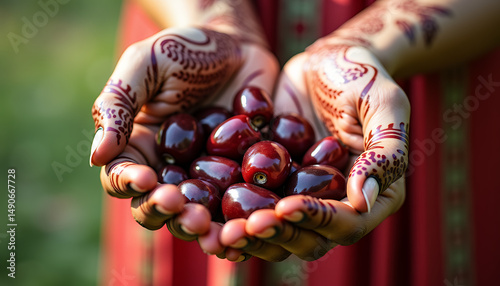 Delicate Henna Adorned Hands Holding Fresh Cherries in Natural Light