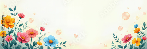 Delicate illustration of blooming flowers in pink, yellow, blue, and red on a light beige background for a birthday theme.