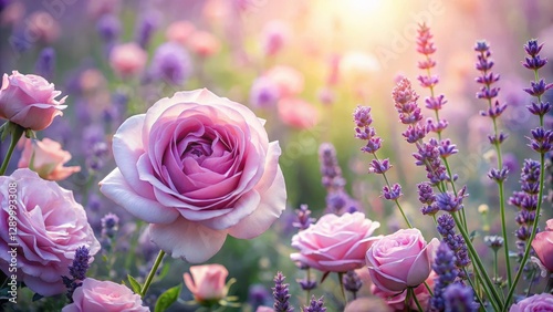 delicate lavender blooms amidst a sea of soft pink roses in a serene garden setting, pastel, peaceful, pastel, peaceful, rose