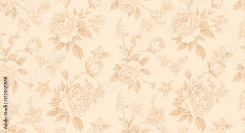 Delicate, light beige floral pattern features a repeating design of roses and small blossoms.