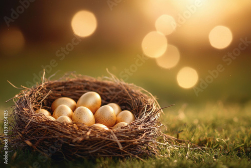 delicate nest with multiple golden eggs illuminated by soft sunlight, creating serene and enchanting atmosphere