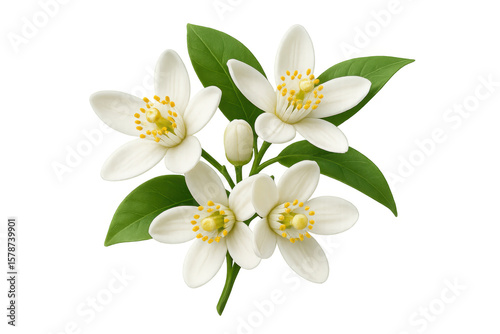 Delicate orange blossoms with vibrant green leaves, rendered in realistic illustration against transparent backdrop