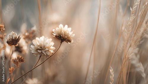 Delicate, pale blooms amidst golden grasses. Soft focus, warm light