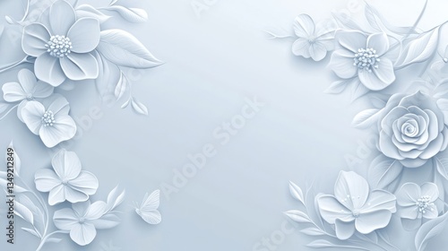 Delicate paper flowers border, light blue background, elegant design, stock photo