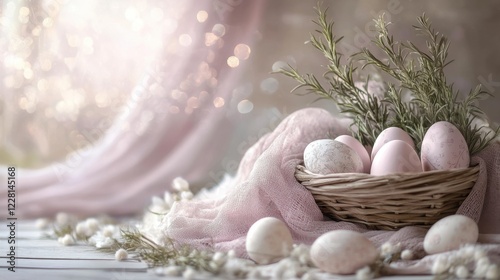 Delicate pastel Easter eggs arranged in a woven basket with greenery and soft pink fabric decor