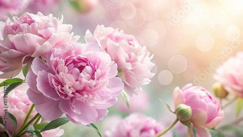 Delicate petals of fluffy pink peonies unfold against a soft focus background
