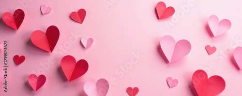 Delicate pink and red paper hearts scattered on a soft pink background , handmade, romantic, delicate