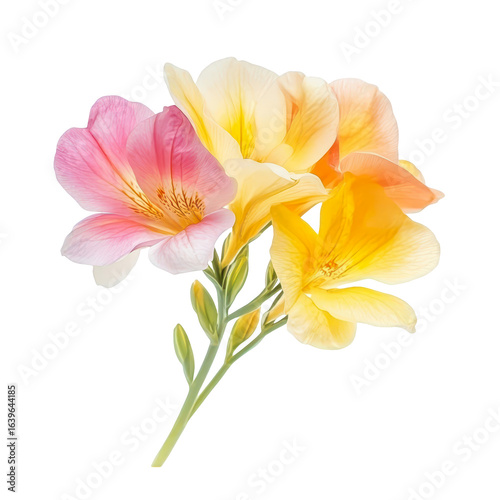 Delicate Pink and Yellow Freesia Flowers on Black Background isolated on transparent background cutout