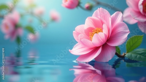 Delicate Pink Blossom Floating Serene on Tranquil Aqua Surface, Reflecting in the Still Water, a Symbol of Peaceful Serenity and Natural Beauty