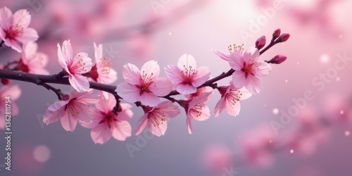 Delicate Pink Blossoms on a Branch, Softly Illuminated by Gentle Sunlight, Creating a Serene and Peaceful Atmosphere