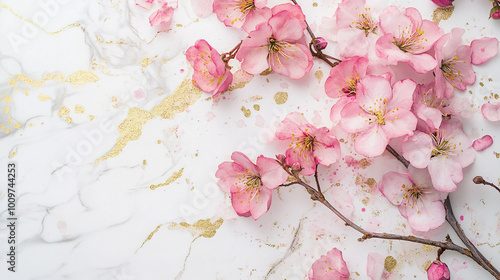 Delicate pink cherry blossoms arranged artfully on a white marble background with golden accents