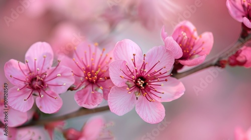 Delicate pink cherry blossoms bloom on a branch, showcasing intricate details and vibrant colors in a serene spring atmosphere