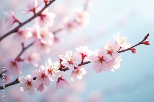 Delicate Pink Cherry Blossoms on a Branch Against a Soft Blue Sky