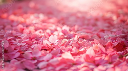 Delicate Pink Flower Petals Blanketing a Ground with Soft Light Filtering Through Trees