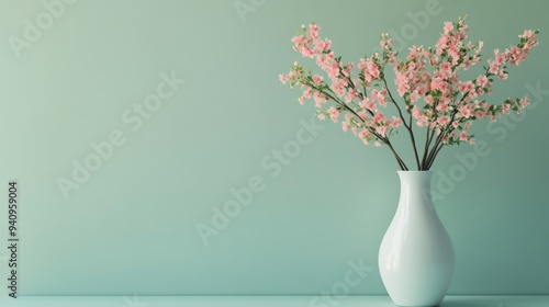 Delicate pink flowers in a white vase placed on a table, with soft pastel green walls in the background, creating a serene and elegant scene.