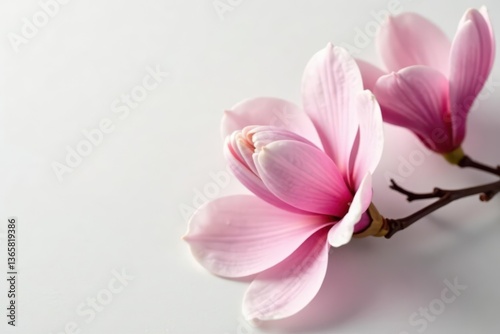 Delicate pink magnolia blossom, crisp white backdrop, sharp focus , elegant, texture
