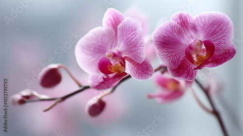 Delicate pink orchids bloom in soft focus, showcasing intricate details and a serene atmosphere.