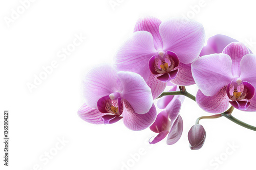Delicate pink orchids blooming in serene beauty, showcasing their elegant petals and vibrant hues against a pure white background.