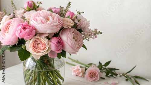 Delicate pink peonies and roses arranged in a vase, botanical, flowers, centerpiece, romance