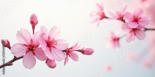 Delicate pink petals unfold on a serene white background, blossoms, branches