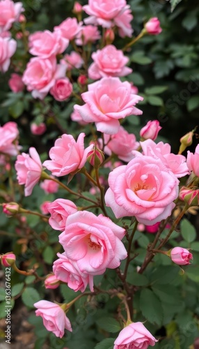 Delicate pink rose bush, long stemmed single blooms, soft petals, texture, close up, stem