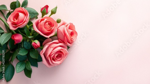 Delicate pink roses arranged on a soft pink background. Perfect for greeting cards, invitations, or romantic themes.