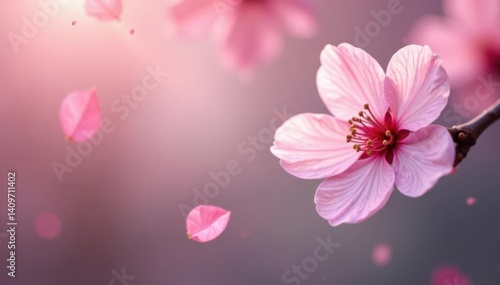 Delicate pink sakura petals float in soft focus, blending with gentle hues of cherry blossom background, abstract, spring