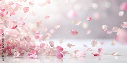Delicate pink sakura petals scattered on a soft white background