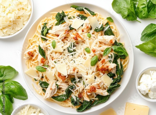 Delicate Plate of Creamy Pasta with Fresh Spinach, Shredded Chicken, and Parmesan on a White Background, Garnished with Basil and Cheese
