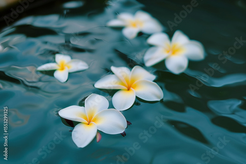 Delicate plumeria flowers drift peacefully on blue tropical water, showcasing a sense of tranquility and elegance.