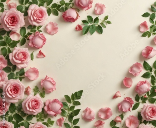 Delicate rose petals and greenery on a cream background , soft focus, delicate lines, wedding card