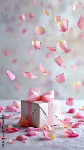 Delicate Rose Petals Dance Around a Gift, Soft Pastel Hues.