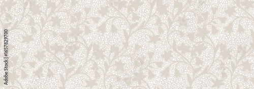Delicate seamless vector pattern with stylized floral silhouettes and abstract dotted texture. Soft pastel beige and white palette creates a calming, elegant design for fabrics and wallpapers