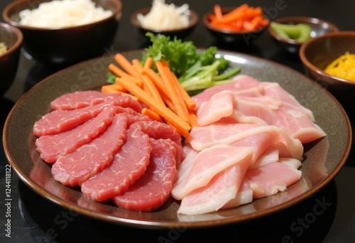 Delicate sliced meats and vibrant vegetables on a rustic earthenware plate